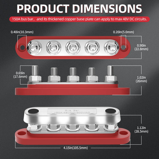 DaierTek Bus Bar 12V Power Distribution Block with Cover 5 x 1/4" Studs Terminal Block Max 150A 48VDC Positive Negative for Auto