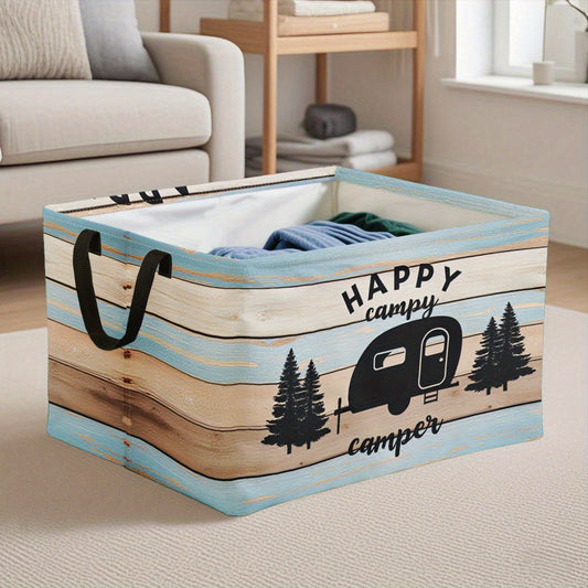 1pc Extra Large Square Happy Camper Vintage Trailer Forest Design Storage Hamper - Durable Oxford Fabric, Collapsible Metal Frame Folding Basket for Camping Gear, Pillow Cases, Sofa Throws & Household Items, Camper Accessorie