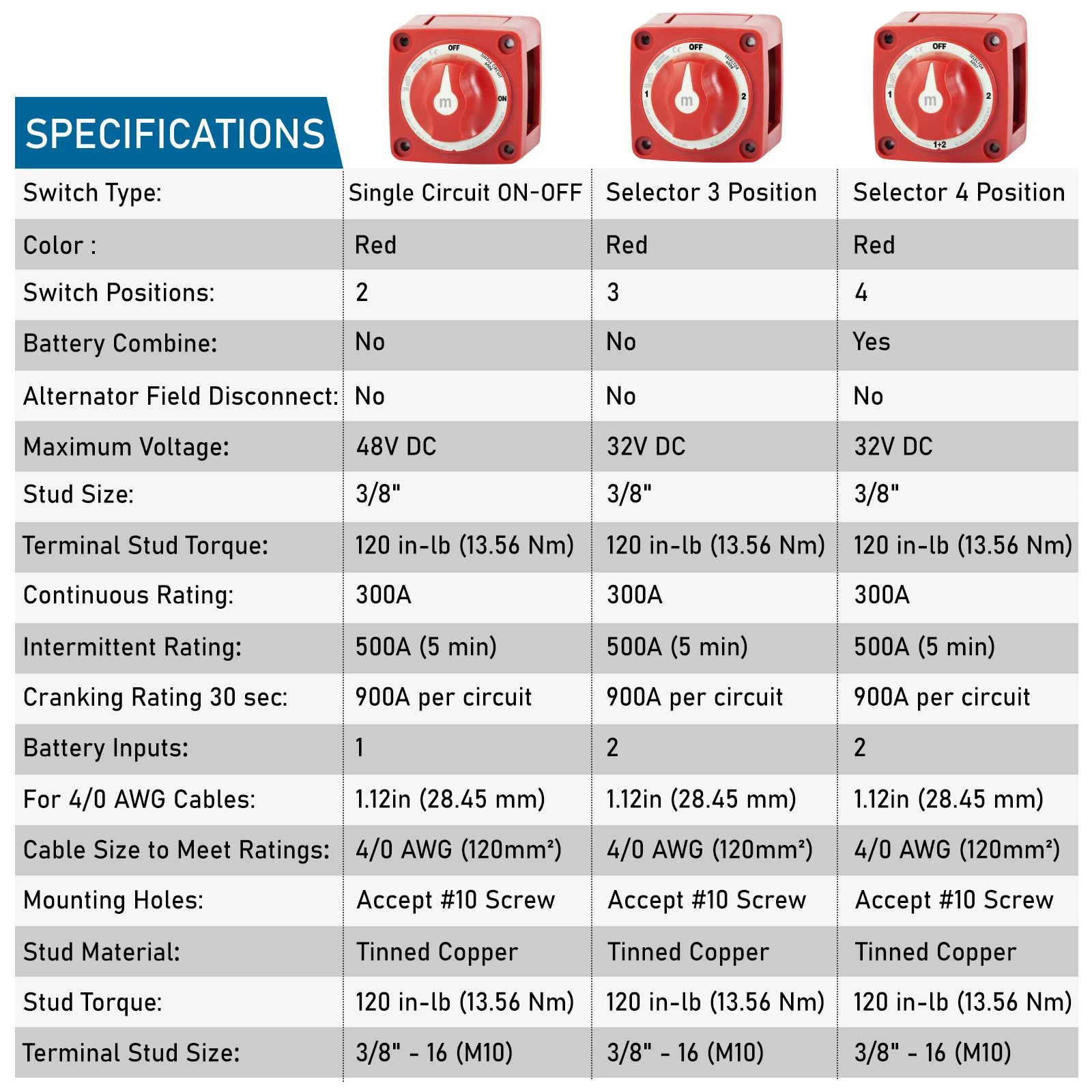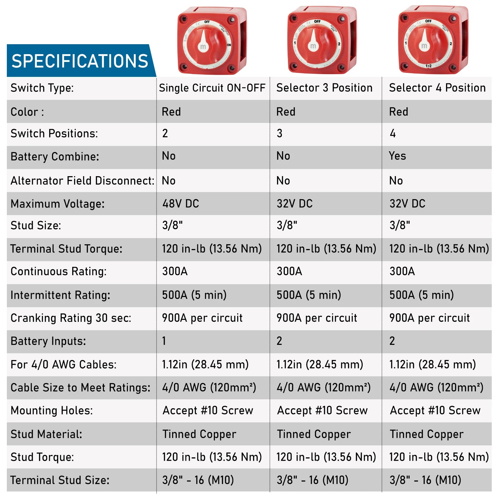 2 3 4 Position Battery Mass Switch Cut Single Dual M-Series Marine Boat 12-48V 100-300A Heavy Duty Isolator Disconnect Rotary