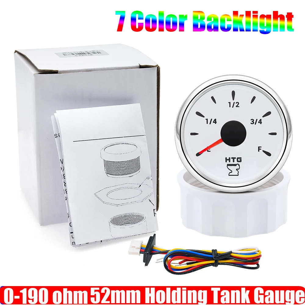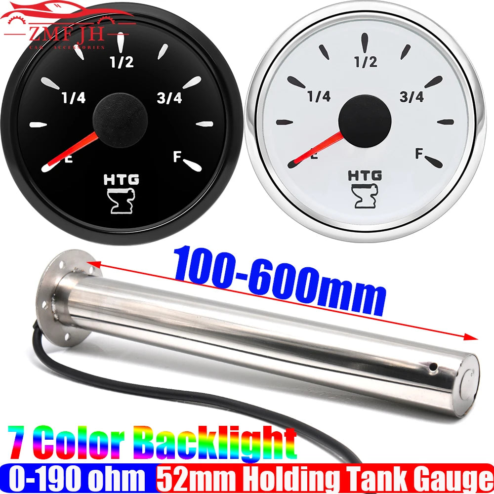 2" 52mm Waste Level Gauge 7 Color LED Holding Tank Gauge 0-190ohm HTG Sewage Level Sensor Steel 100-600mm for Car Boat Custom