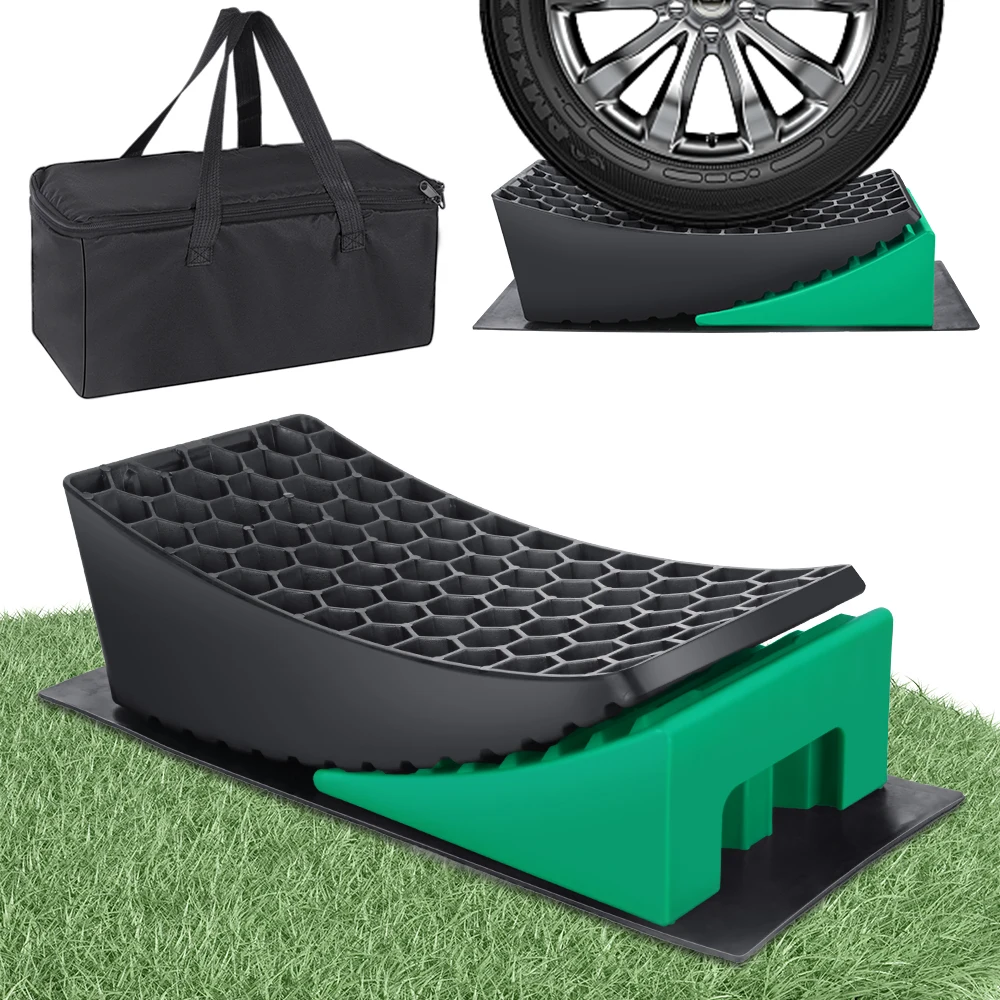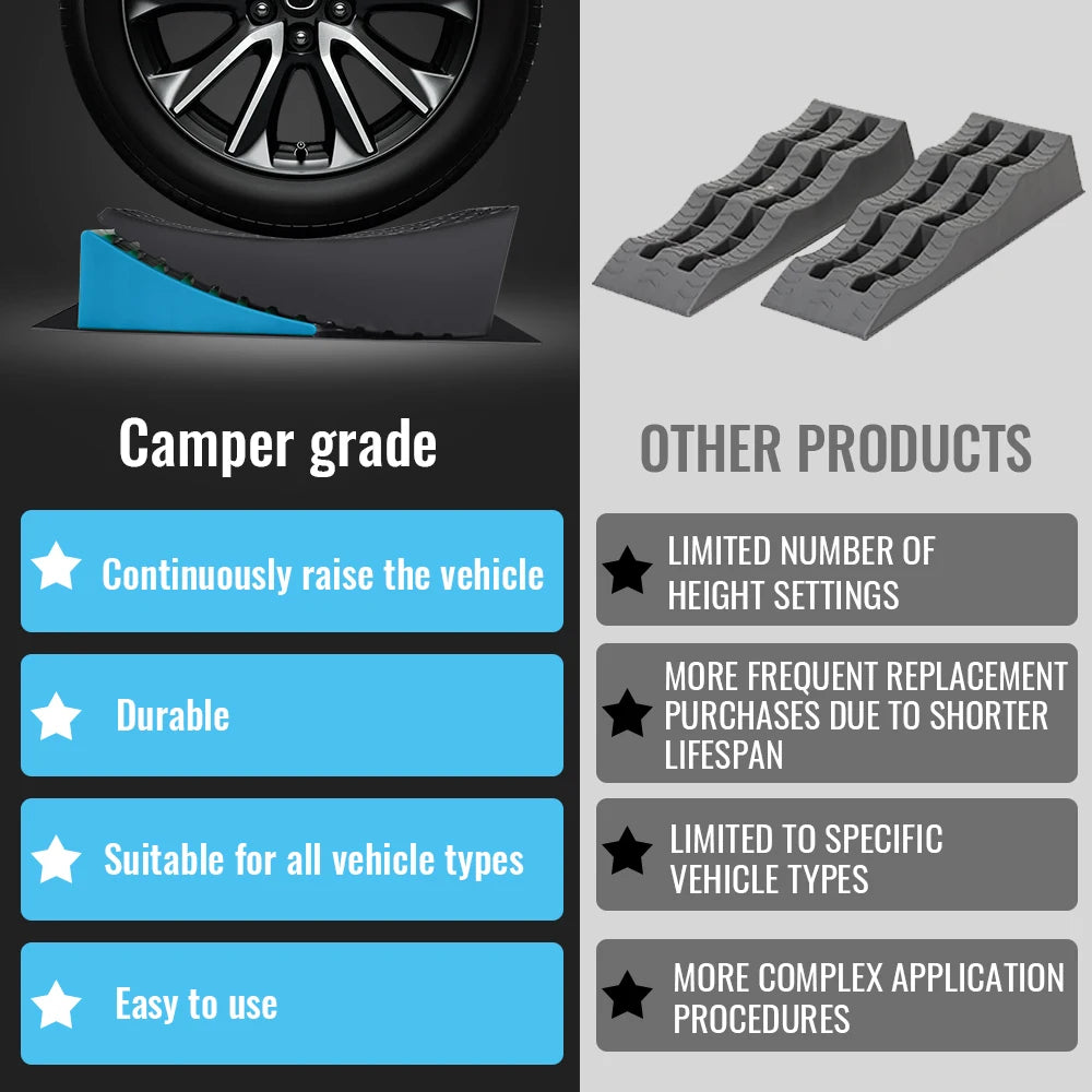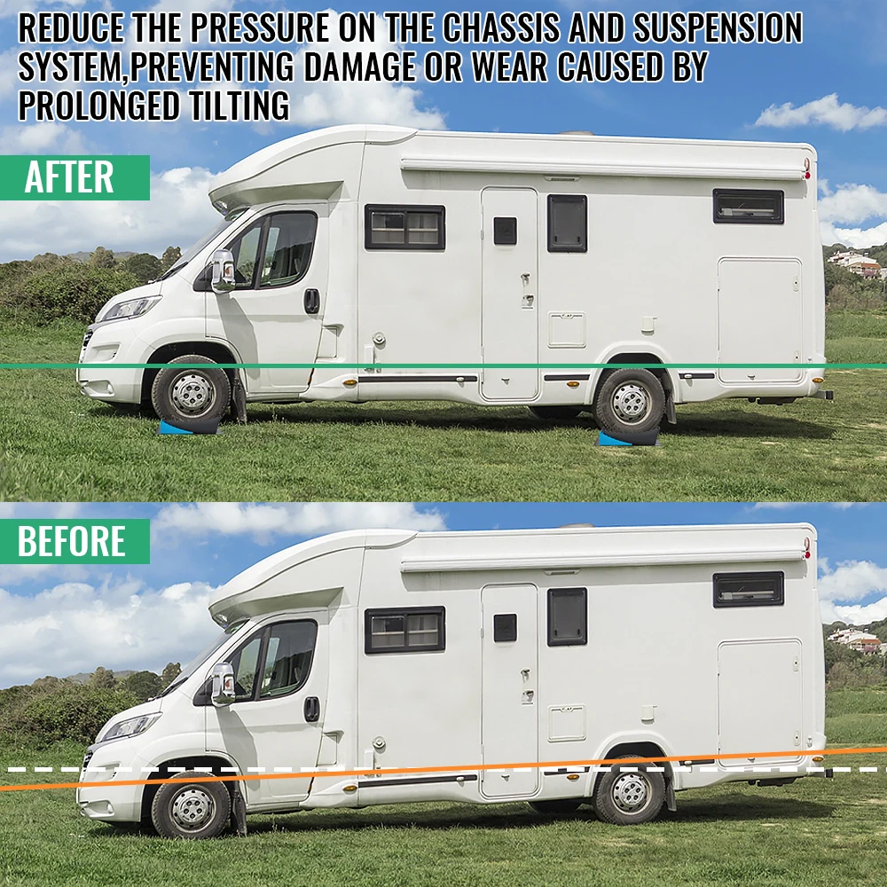 This set includes 2 durable RV leveling ramps with a non-slip surface, made of high-density polyethylene (HDPE) for superior grip and load stability. Supports up to 7000 kg total, ensuring your RV remains stable on various terrains.