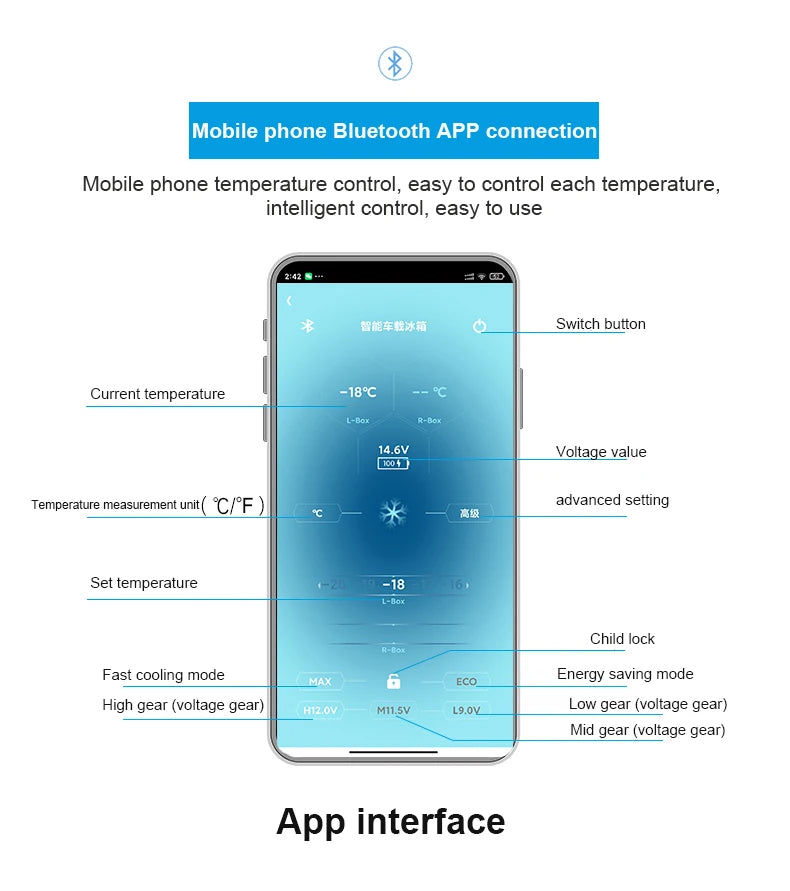 3. Bluetooth intelligent connection of mobile app: intelligent temperature control, more convenient use, breaking distance limitations, and easy control inside and outside the car