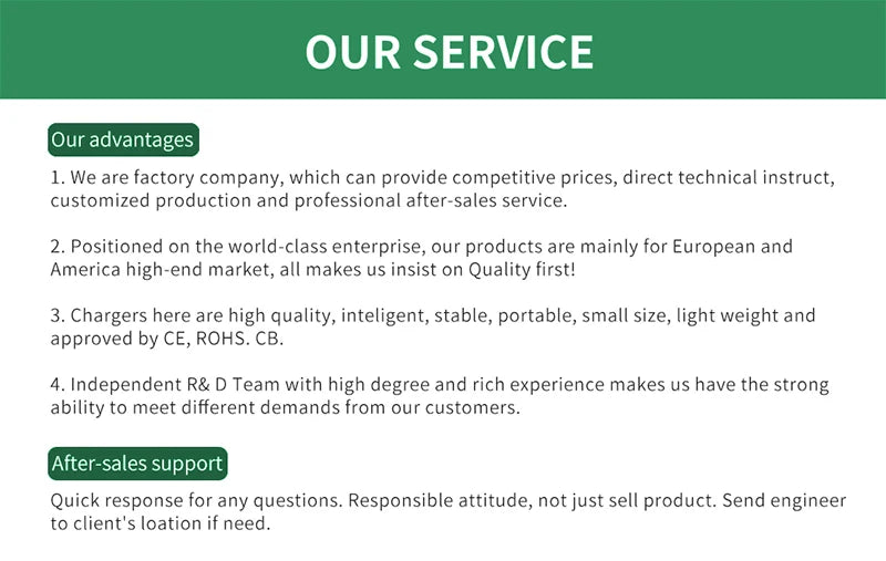 Safety certifications CE, RoHS, FCC Directive-compliant, Intelligent IC control ,full automatic transition of CC,CV and Float/Cut-off rickle, meet the demands for different Curve. |
