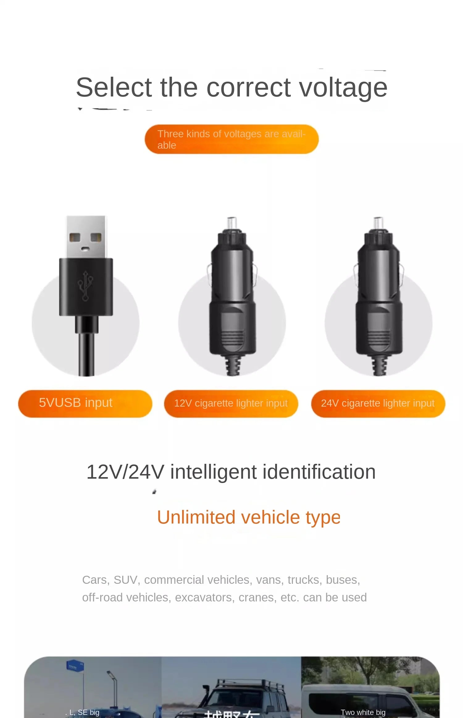 12V: cigarette lighter interface, suitable for minibuses, school buses and off-road vehicles.