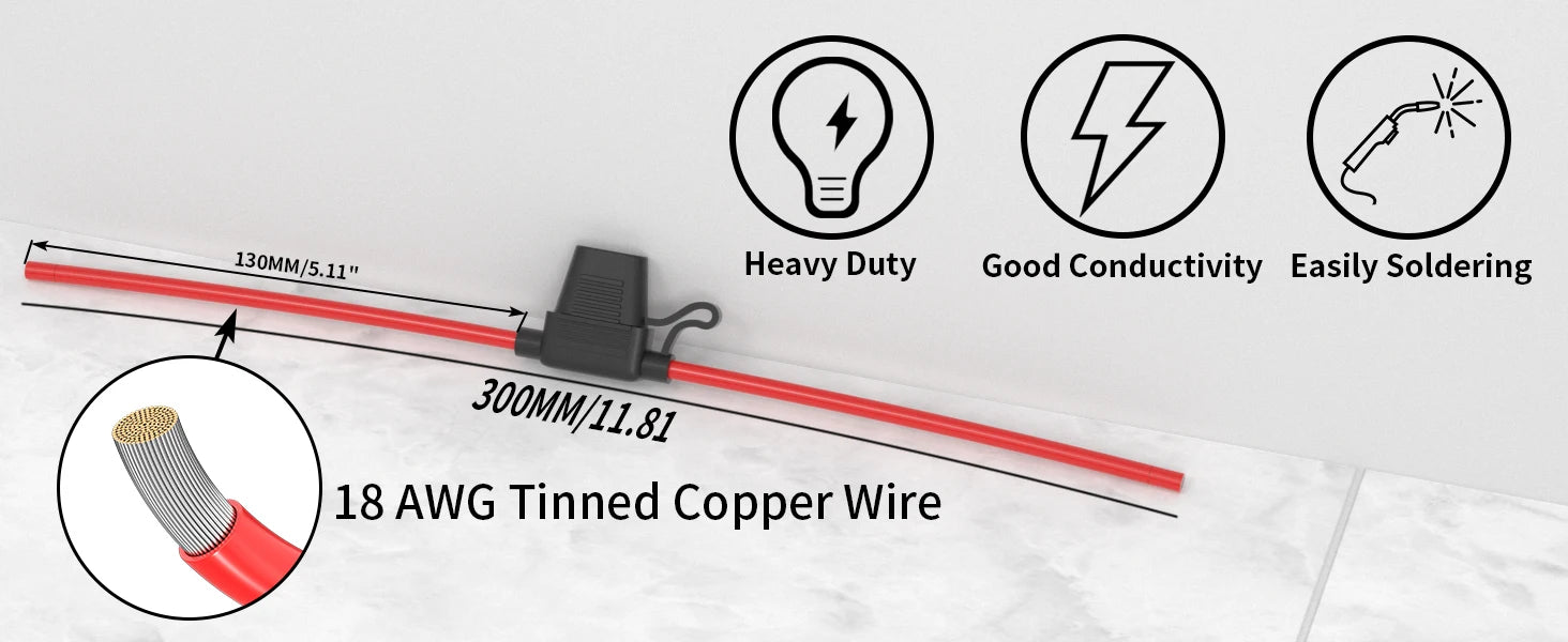【18 Gauge Wire】 - The wires of this inline fuse holder 12v is 18 awg design, which is tinned to enhance its corrosion resistance performance and makes it become more easily soldered.