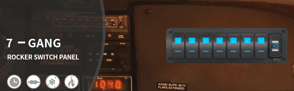 【Rocker Switch Panel】This DC 12V 20A/24V 10A 7 gang rocker switch panel control system can better control multiple circuits. IP66 waterproof switch panel is made of high-quality ABS and PC switches and conductive pins, which is corrosion resistant, strong flame retardant and durable.
