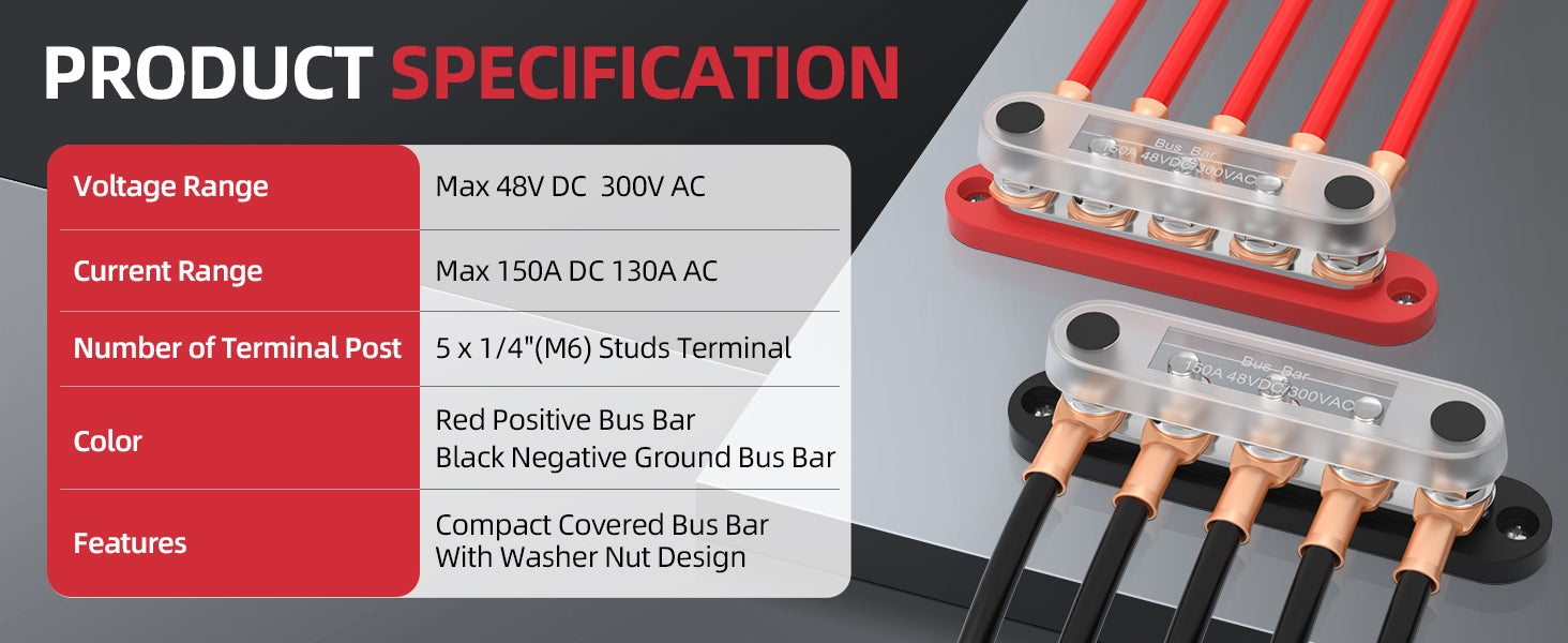 Package Included - A pair of 12V battery bus bars with covers: A red positive bus bar and a black ground bus bar, two sets of mounting screws and each of bus bar with 5 terminal posts.