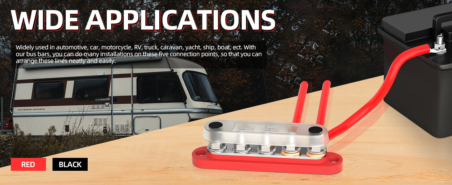 The distribution block with cover can be widely used in automotive, cars, motorcycles, RVs, off-road, trucks, marine, yacht, ships, boats, and so on. With our bus bars, you can do many installations on these five connection points, so that you can arrange these lines neatly and easily.