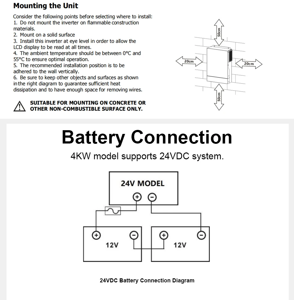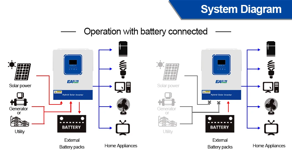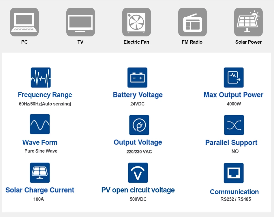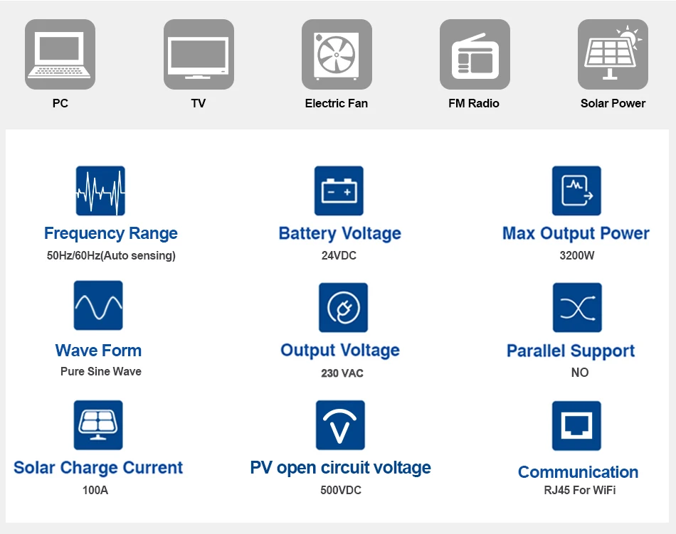 3.Supports connection of lead-acid battery and lithium battery,Compatible to mains voltage or generator power