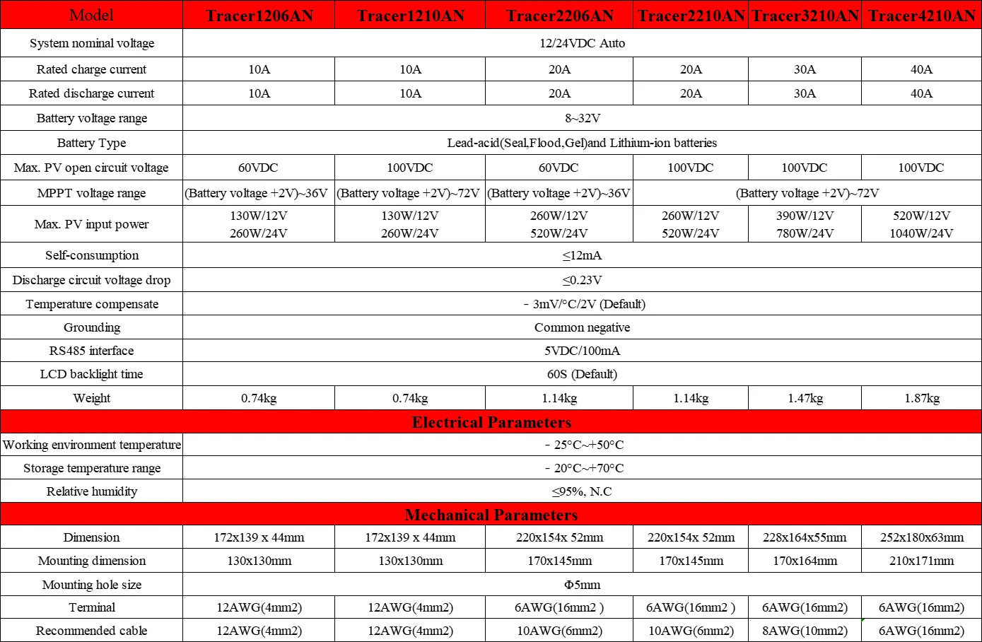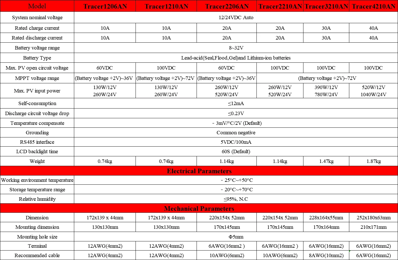 The Tracer AN series. Based on common negative design and advanced MPPT control algorithm, with LCD displaying running status, this product is artistic, economical and practical. Improving the MPPT control algorithm further, Tracer AN series can minimize the maximum power point loss rate and loss time, quickly track the maximum power point of the PV array and obtain the maximum energy from solar modules under any conditions; and can increase the ratio of energy utilization in the solar system by 10%-30% compared with a PWM charging method. The limitation function of the charging power and current and reducingcharging power function automatic improve the stability which works even connecting oversize PV modules and in high temperature, and increase the professional protection chip for the communication port, further improving the reliability and meeting the different application requirements.