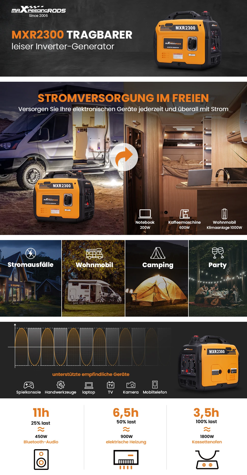 • Inverter technology – for sensitive devices (computers, TVs, etc.)