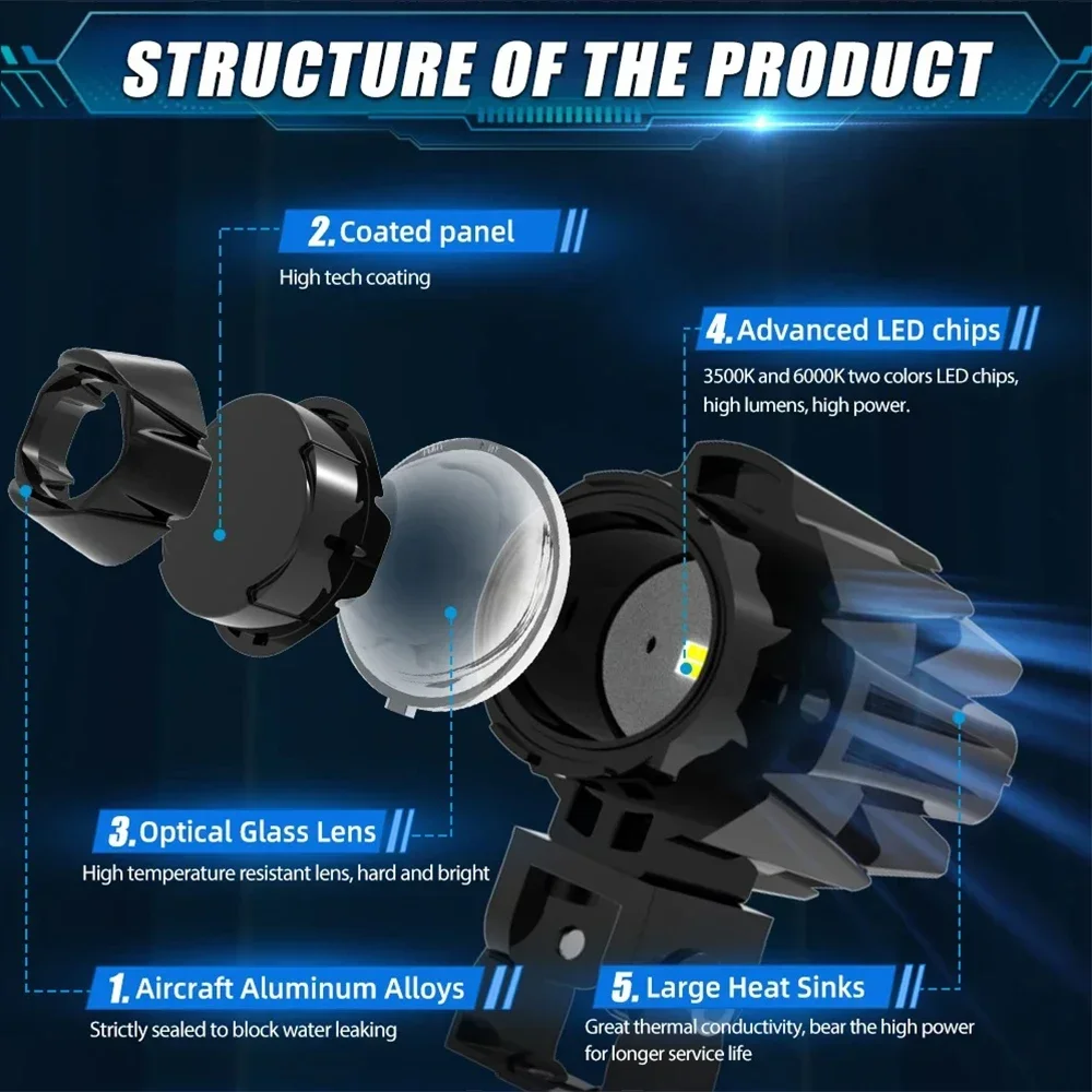 3: amber +white light (Hybrid beam)-See clearer in fog/rain/snow. And the led pods spotlights are ideal for adventure bikes, tourers, Harley Davidson Baggers, plus all kinds of cars, buggies, quads/trikes, atv, and so on...but also fit for different types of Off Road Jeep SUV ATV UT Truck/Boat.