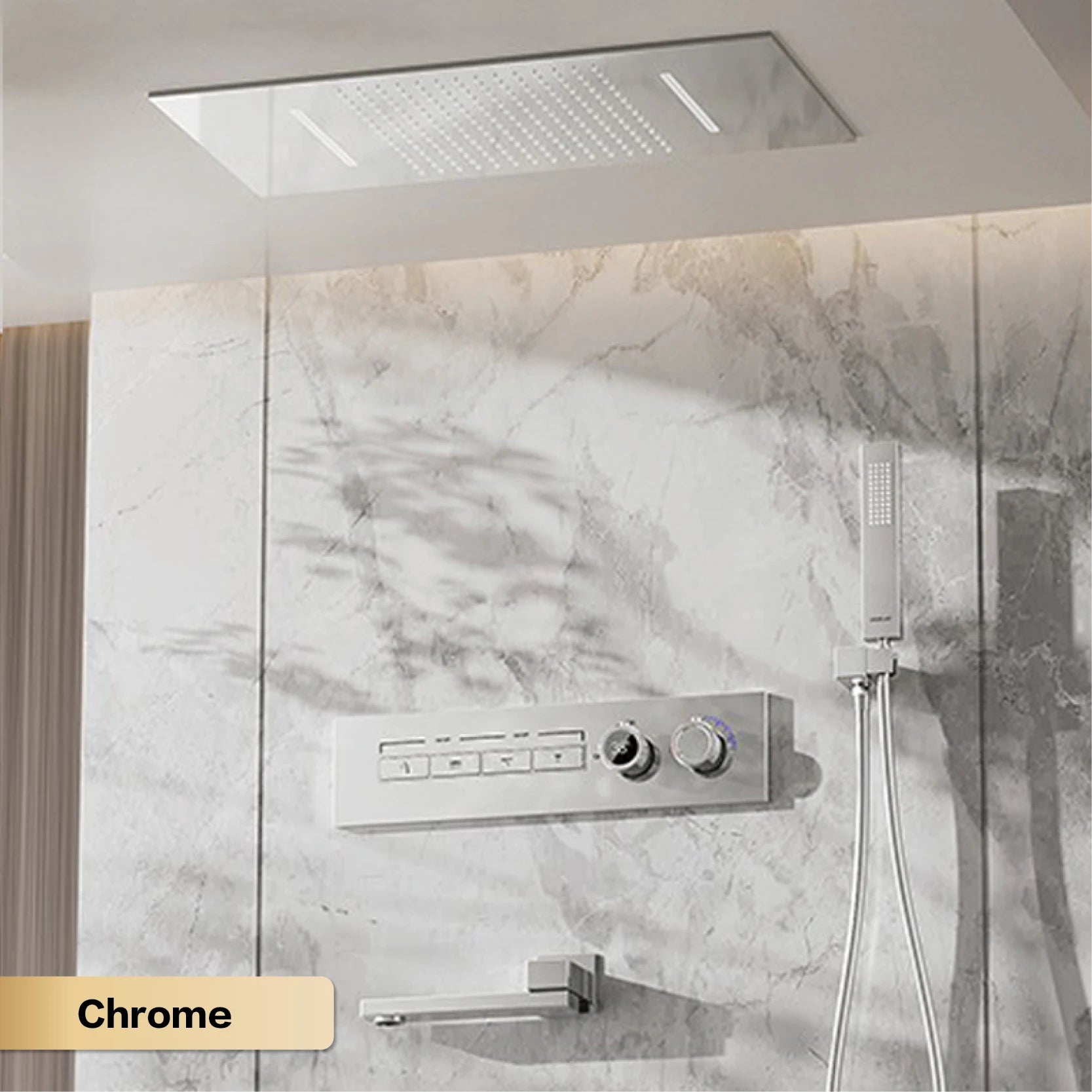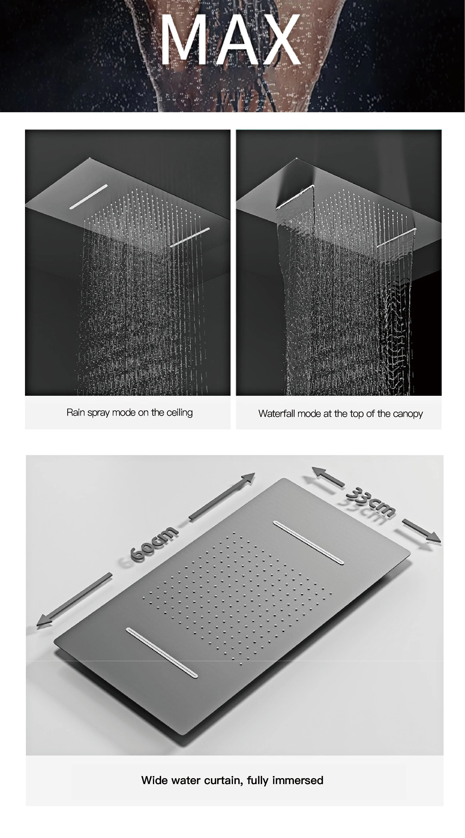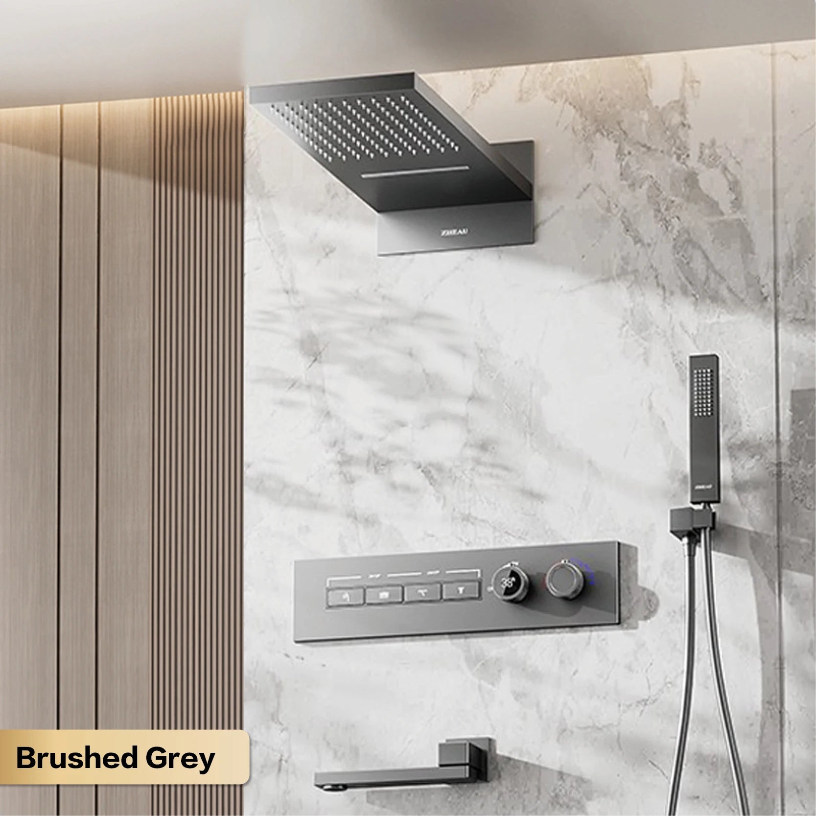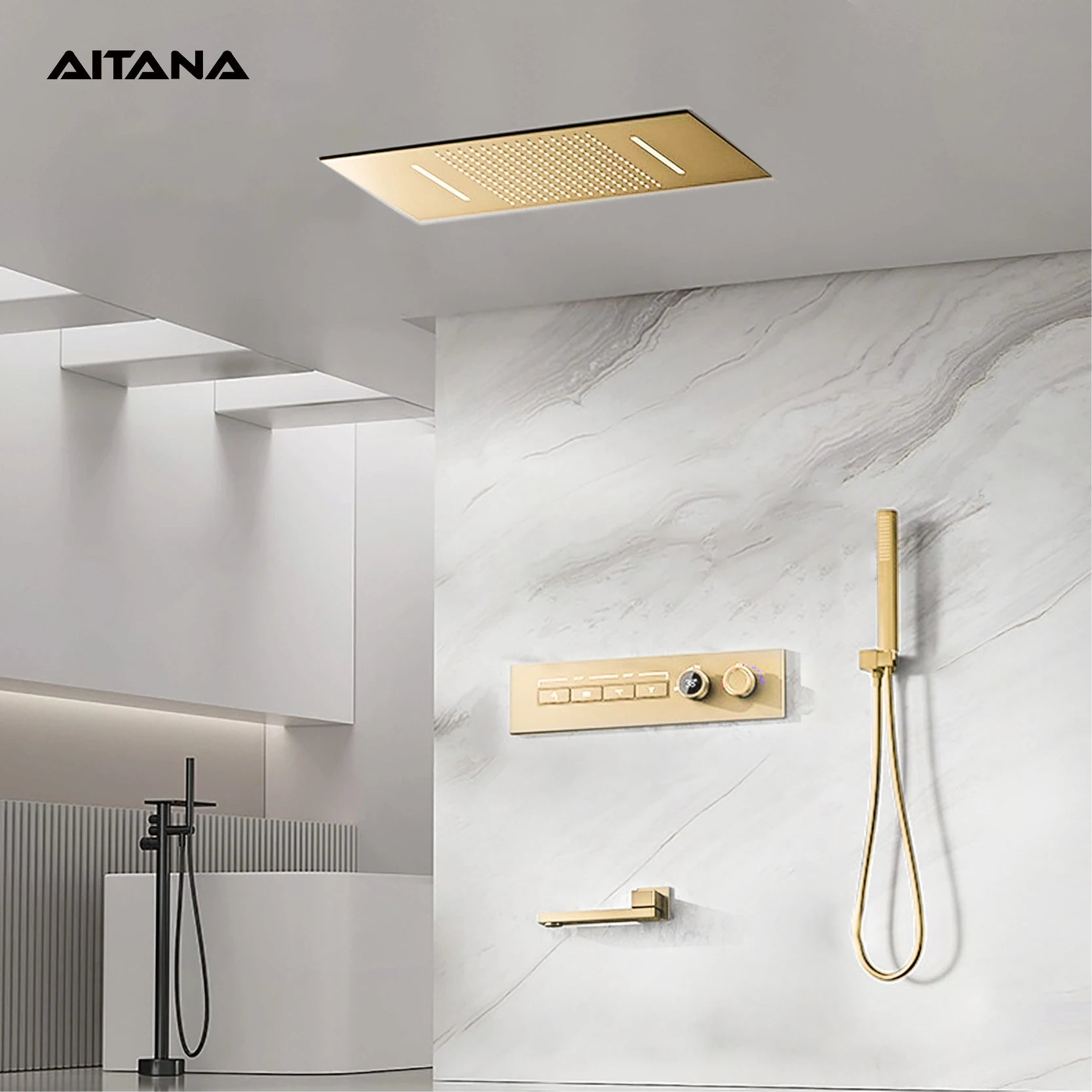 Modern brushed gold brass LED digital ceiling embedded shower system. Thermostatic 4-function waterfall/rain shower bathroom Tap