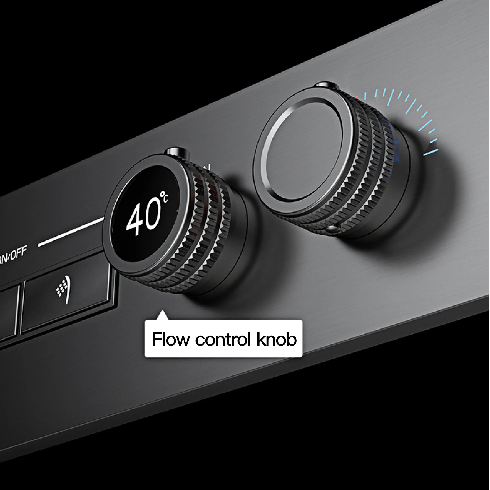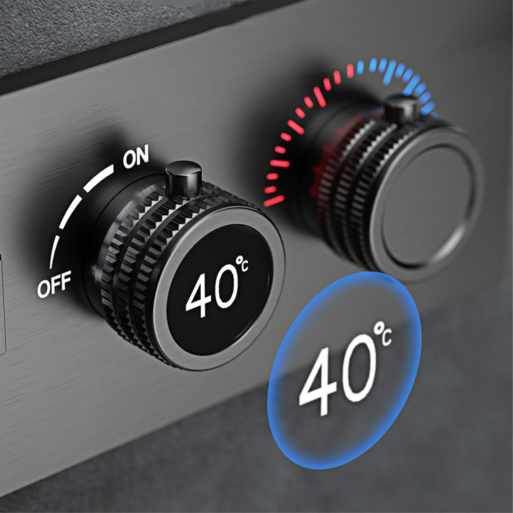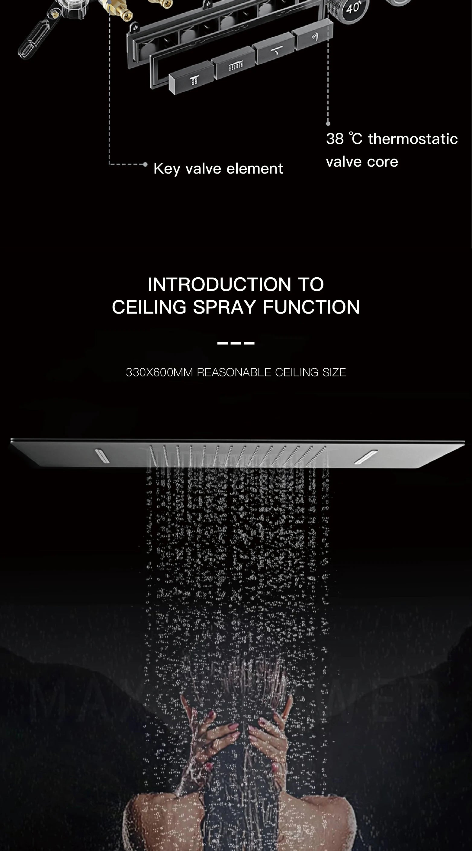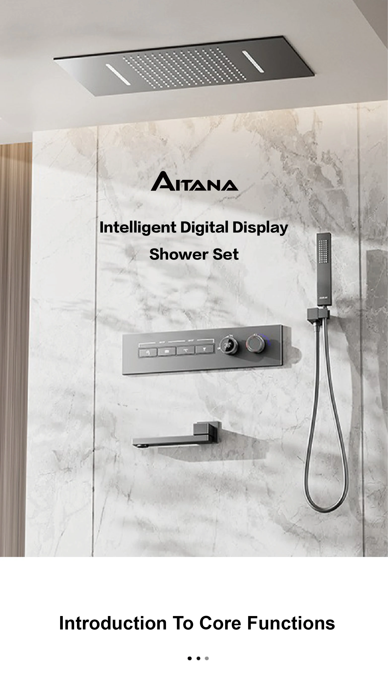 Modern brushed gold brass LED digital ceiling embedded shower system. Thermostatic 4-function waterfall/rain shower bathroom Tap