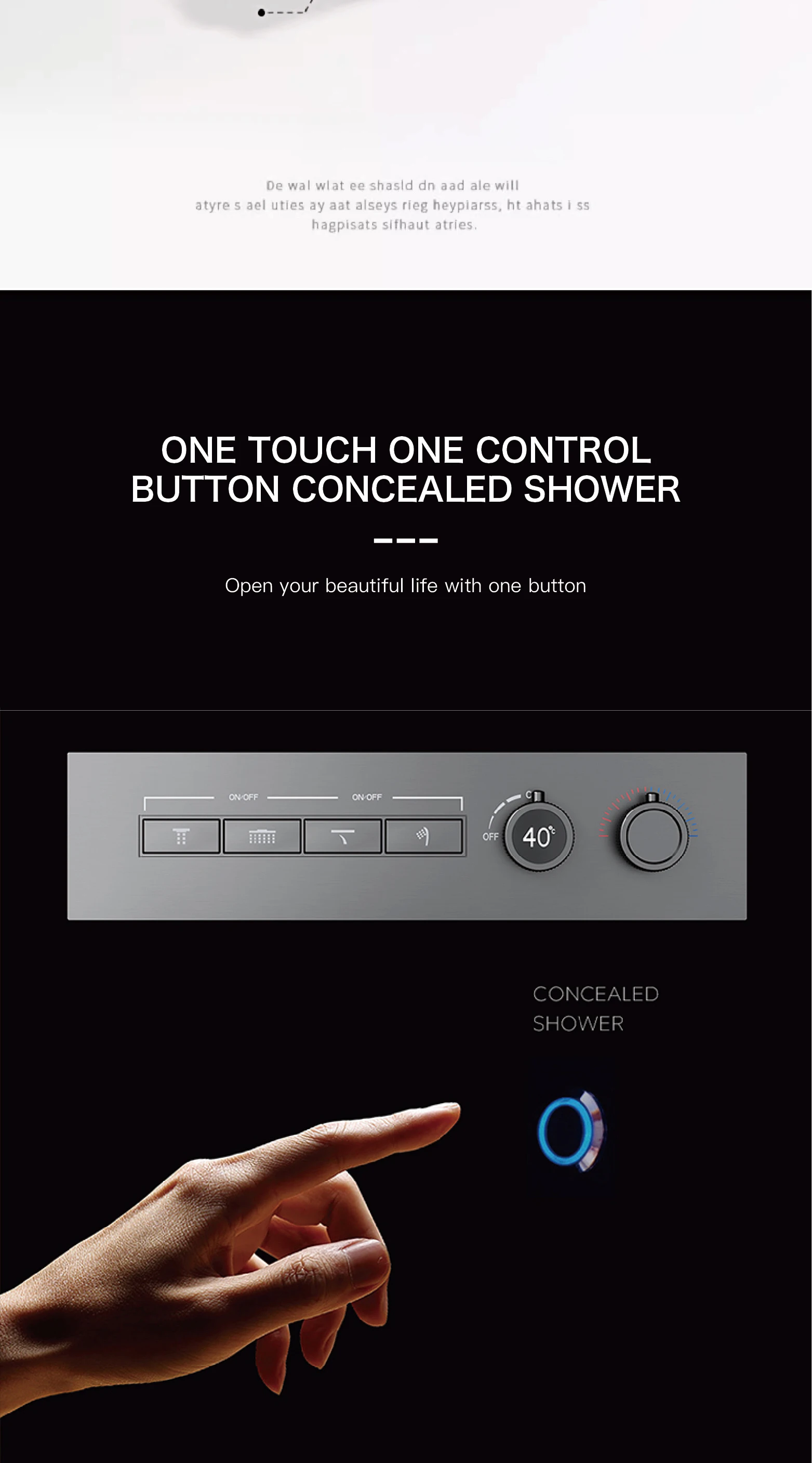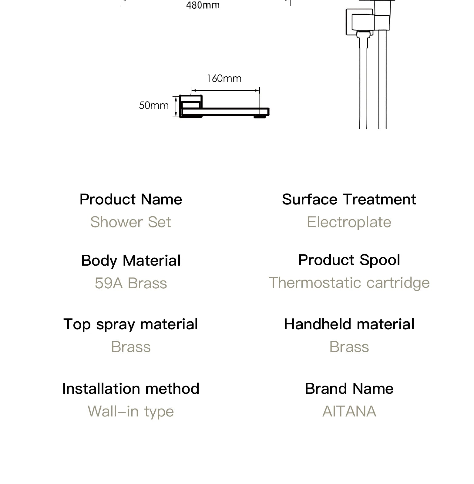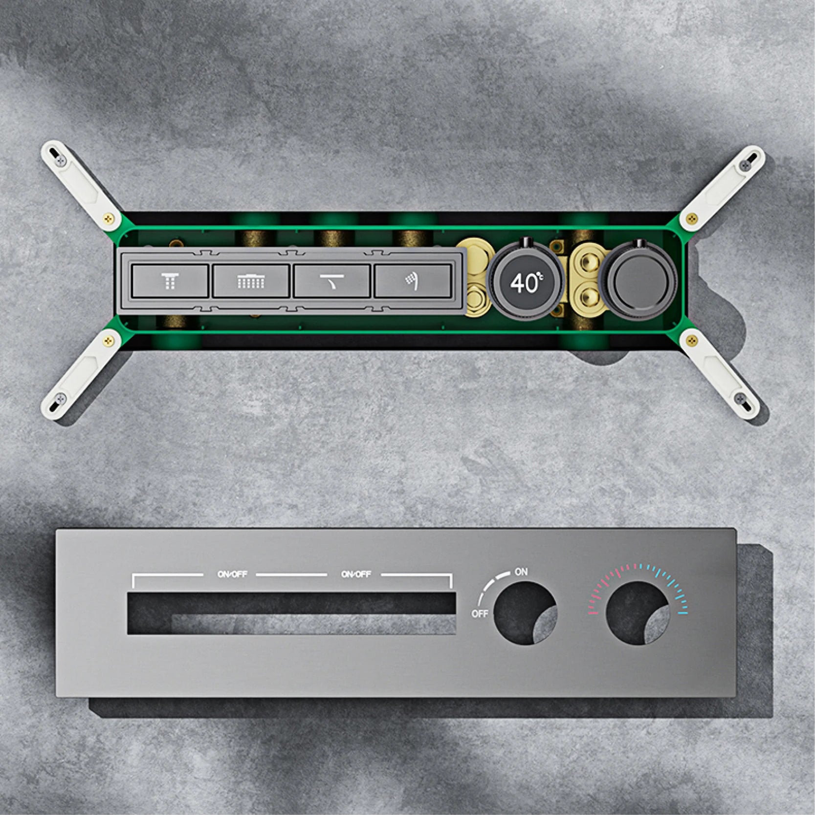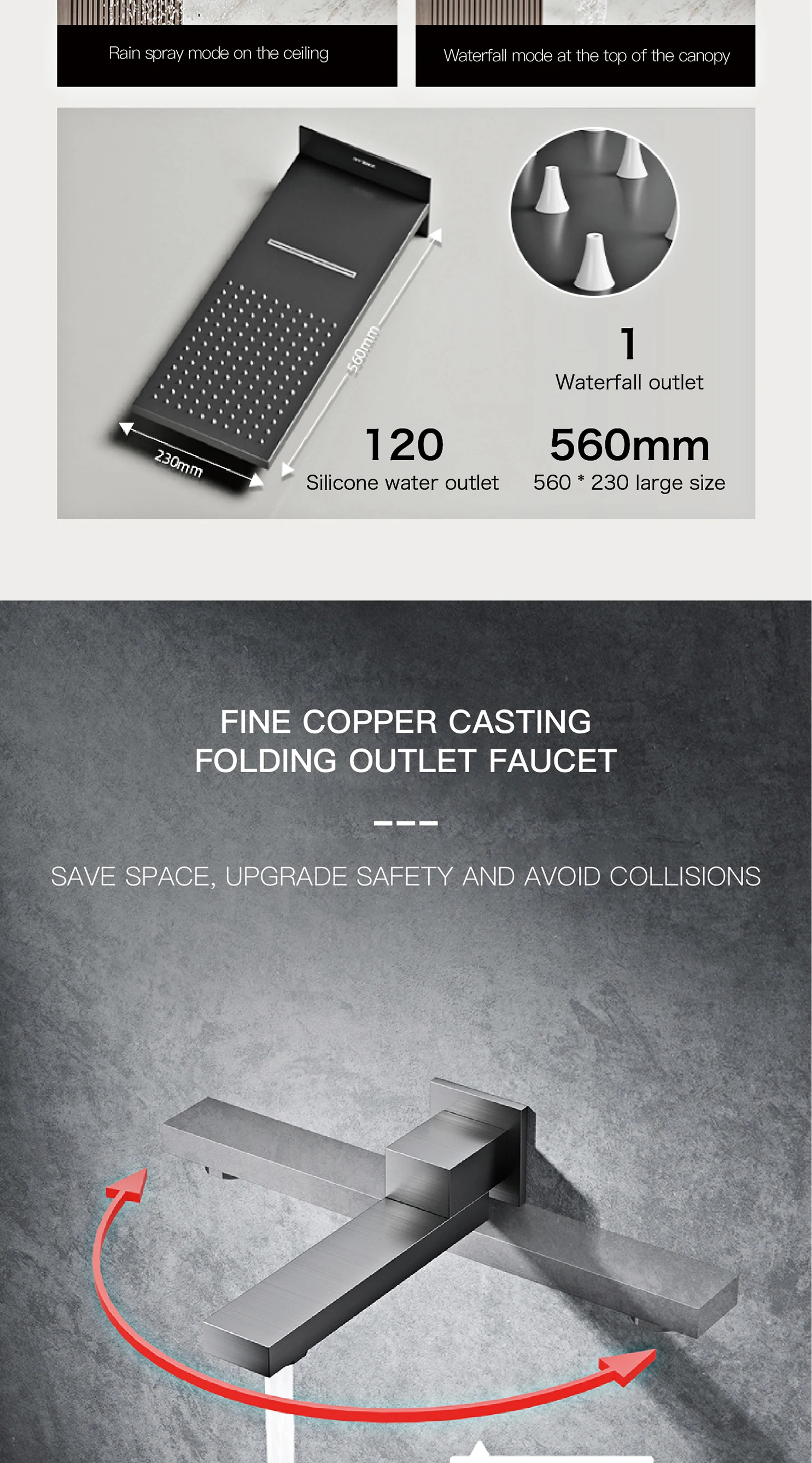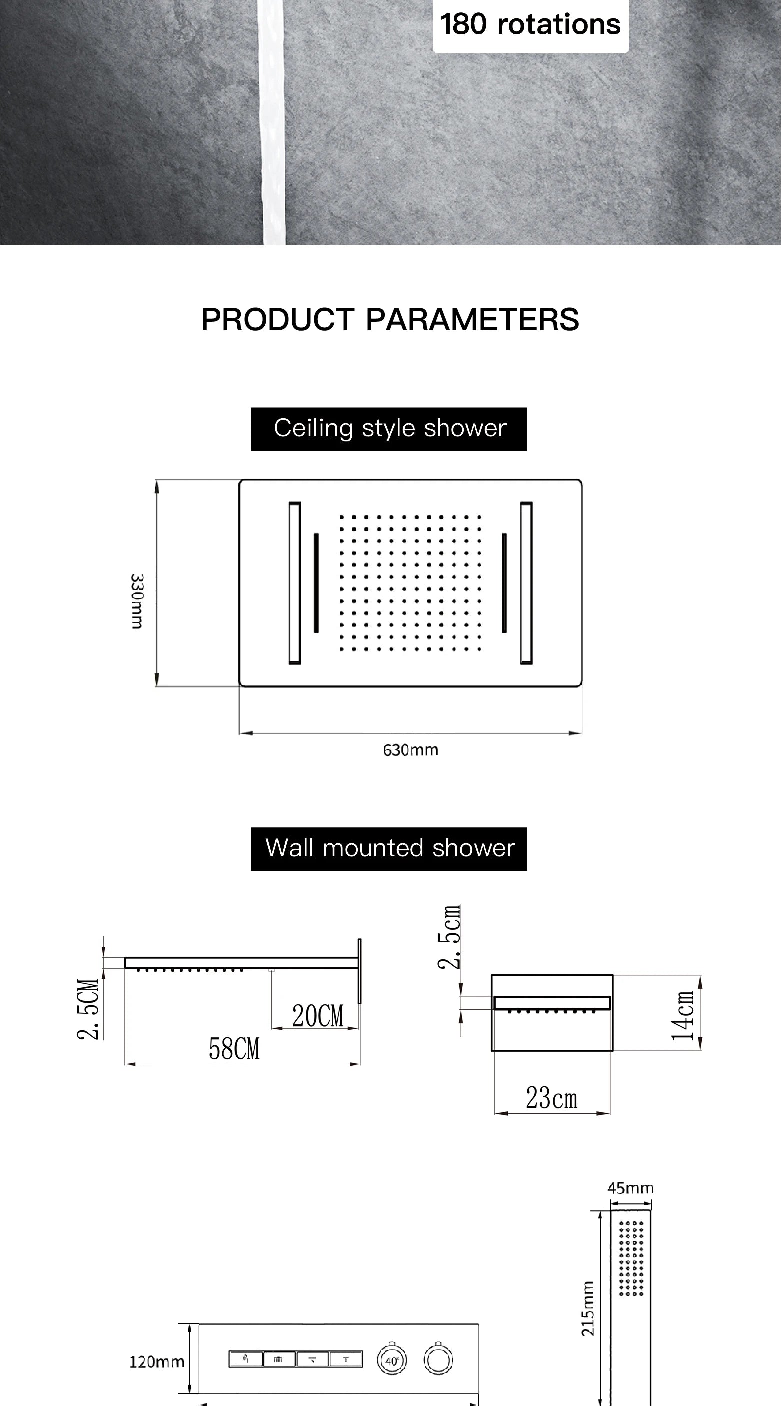 Modern brushed gold brass LED digital ceiling embedded shower system. Thermostatic 4-function waterfall/rain shower bathroom Tap