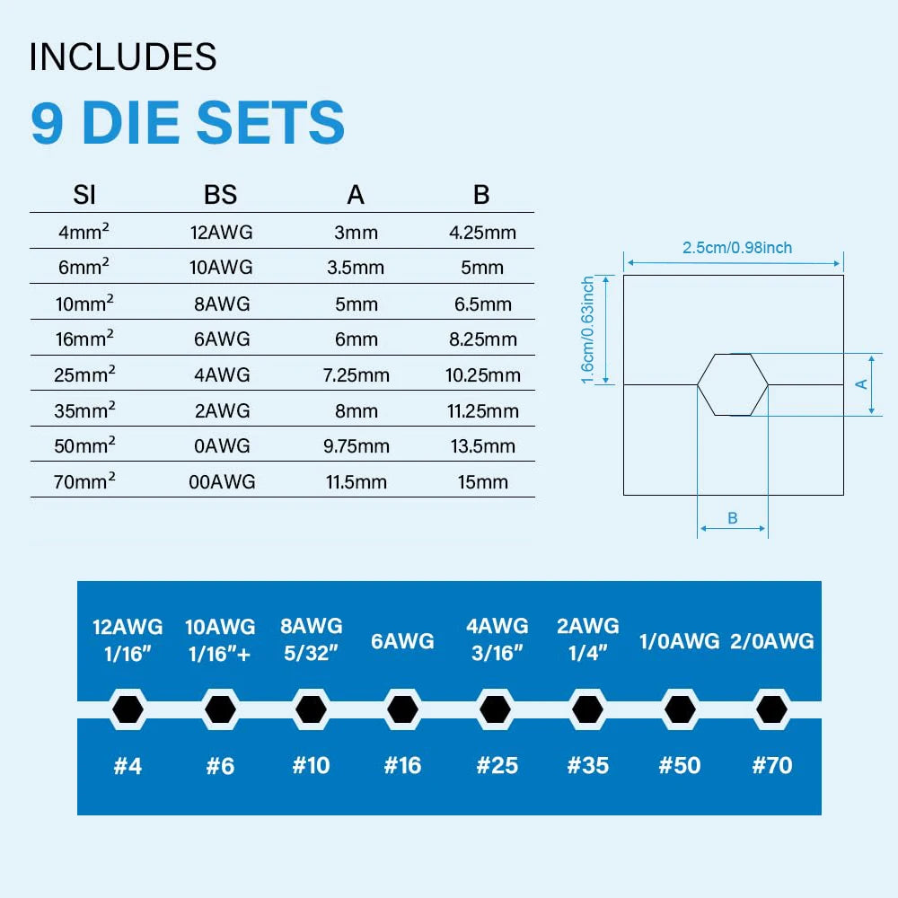 Chrome Plated Crimp Dies -- Hydraulic Crimper Tool with crimp dies for 12 AWG, 10 AWG, 6 AWG, 4 AWG, 2 AWG, 0 AWG, and 2/0 AWG, and 1/8" for stainless steel wire rope, you can create strong hexagonal crimps for a clean, efficient look for your project. Hydraulic Lug Crimper are easier, more efficient and less labor intensive than hand crimping.