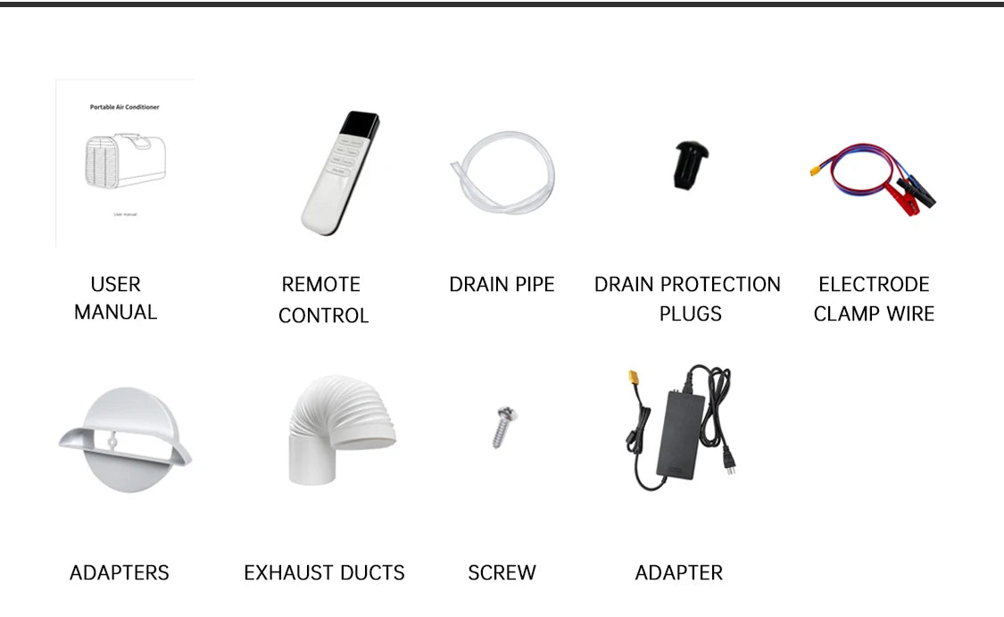 Host / exhaust pipe / drain pipe / adapter / manual / waterproof plug / screw / remote control |
