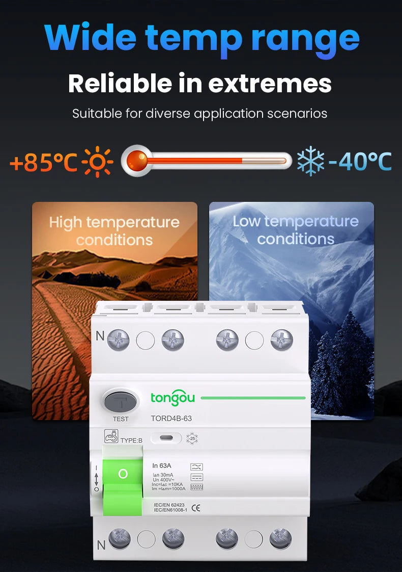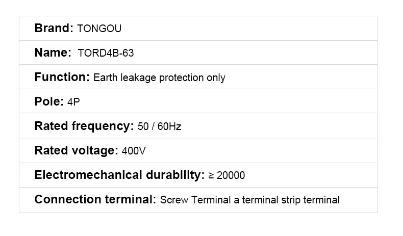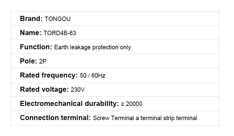Please note this is an RCCB (Residual Current Circuit Breaker) which provides leakage protection only. It does not include short-circuit protection. For complete protection including both leakage and short-circuit protection, please select our RCBO model (TOBD6)