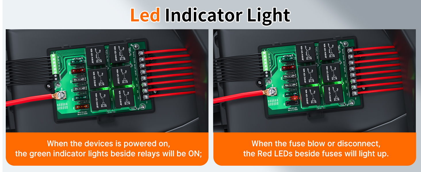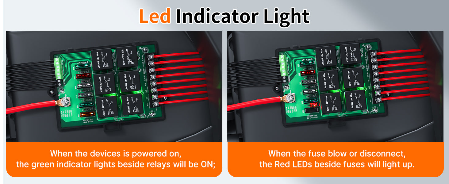 LED indicator light: The relay box 12v is equipped with LED indicator light for each relay and blade fuse to allow you to know their working states, design with overvoltage protection and surge protection safety protection, to make your work more safe and reliable