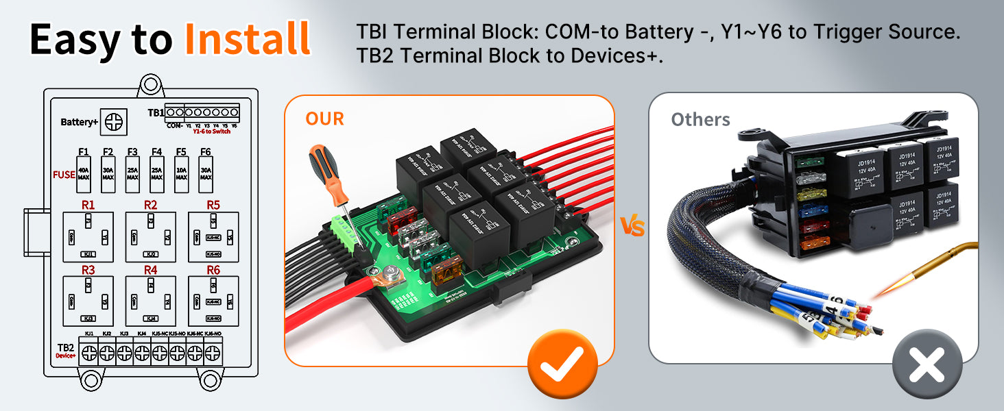 Ease of Installation: Our unique and upgraded fuse relay box comes with relay module, all the accessories are assembled on this relay panel, so you don't need to weld the wires. This design of our relay panel box also makes your installation more flexible and convenient