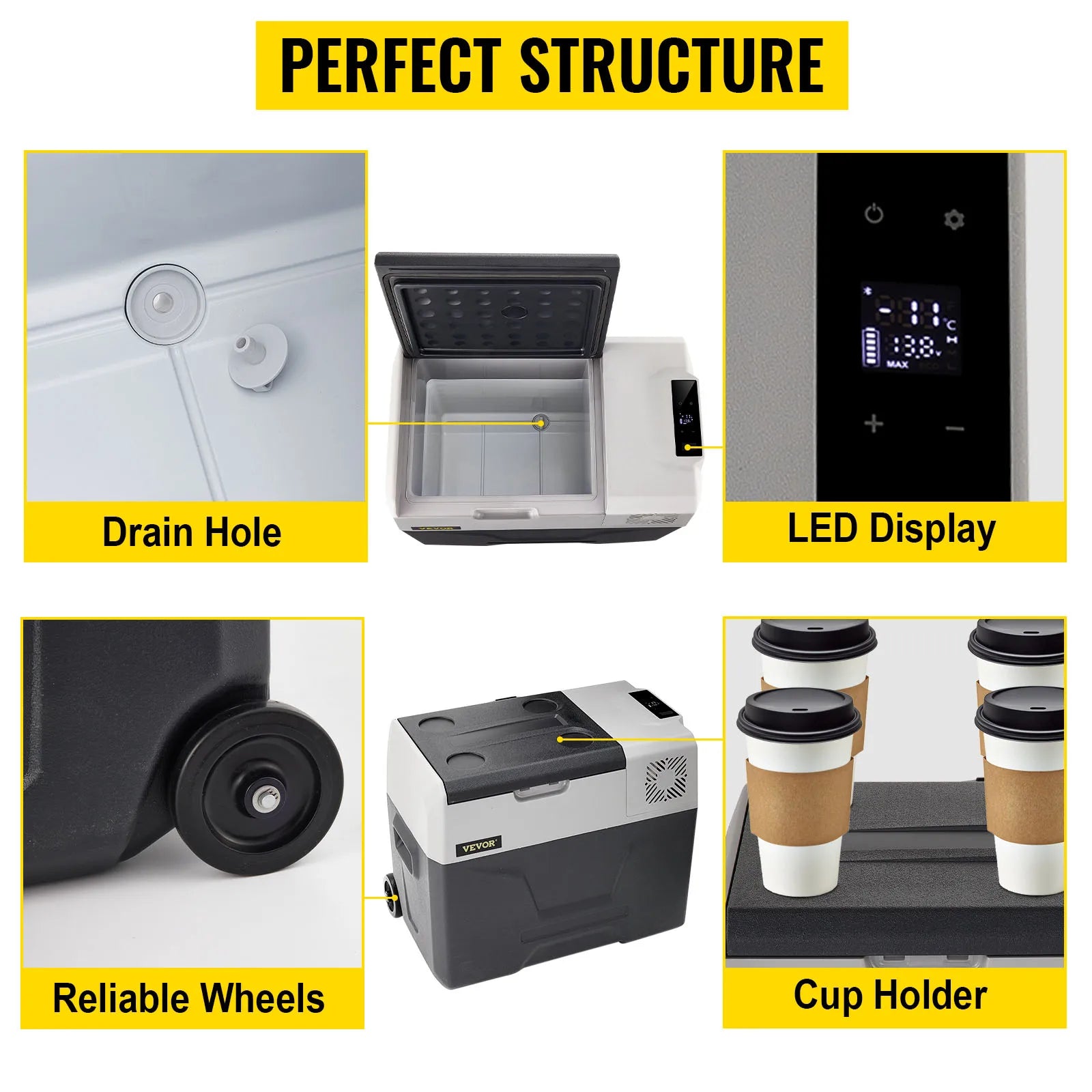 【Perfect Structure】: Our car refrigerator is equipped with animated details. The digital display can adjust the temperature; 2 reliable wheels is portable for you to carry this refrigerator; the USB interface can connect the mobile phone; the built-in handle is convenient to move; cup holders can hold drinks stabler in the car. What's more, you can use the mobile app to control the refrigerator.
