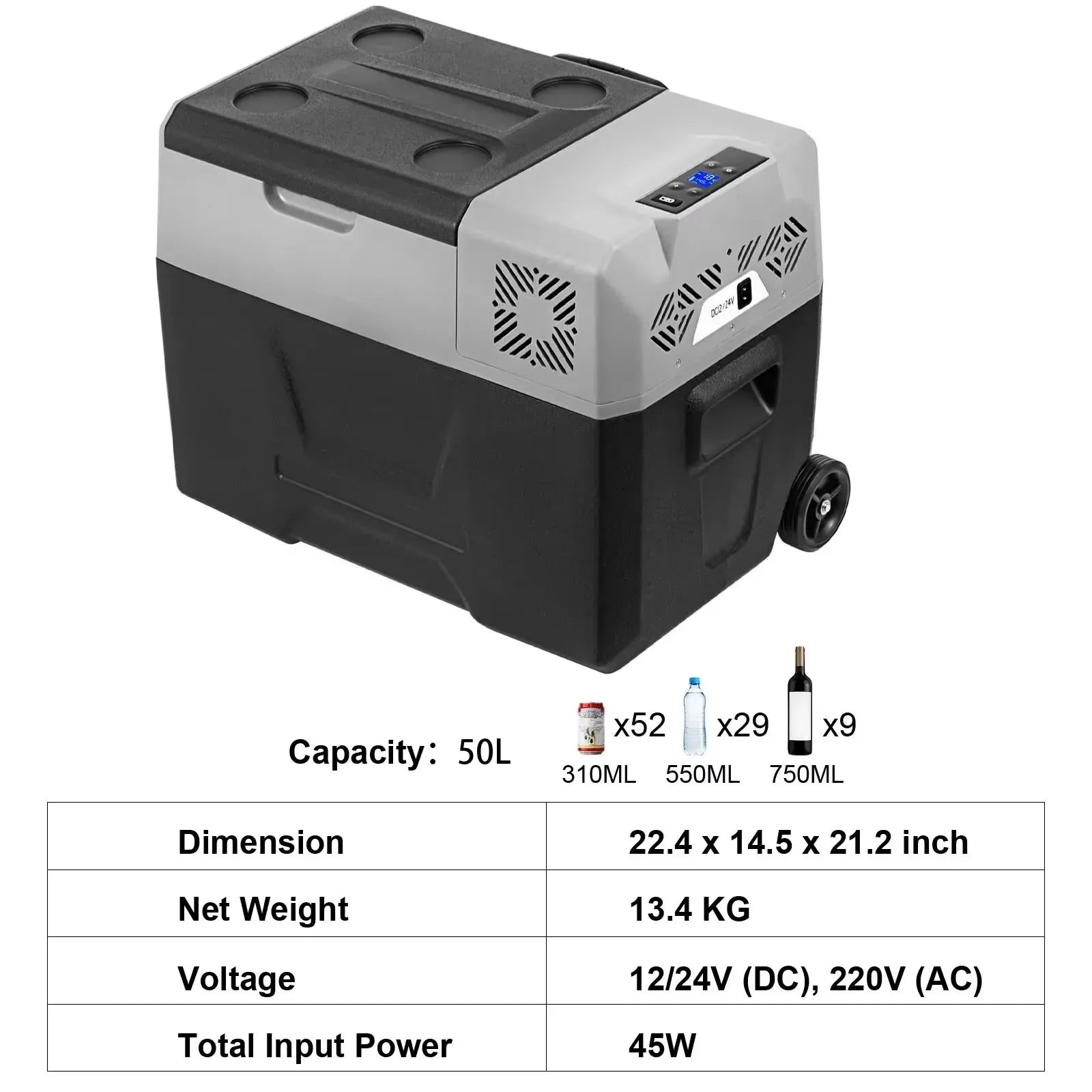 【53Qt Storage Space】: This portable refrigerator with 50L/53 Quart capacity is large enough to fit 84 cans of 330 ml/11.1 floz cola, 37 bottles of 550 ml/18.6 floz drinks, and 18 bottles of 750 ml/25.3 floz red wines. Our refrigerator has CE certification; you can store many drinks, vegetables, fruits, seafood, meats, skincare products, breast milk in it.