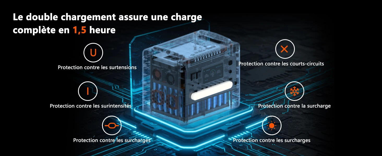 Protection contre les surintensités, les surtensions, les surchauffes, les surcharges, les décharges excessives et les courts-circuits |