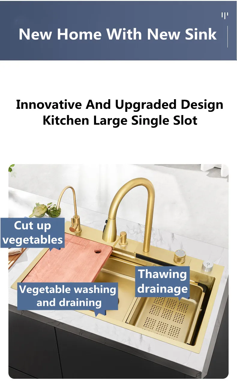 Waterfall Kitchen Sink Single Bowl Kitchen Sinks Gold 304 Stainless Steel Bar Sink With Pull-Faucet,Nano Home Sink