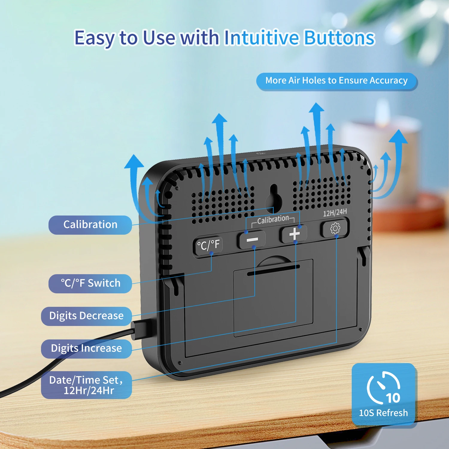 Home-Use Accuracy & Fast Refresh: Temperature range 14.2˚F~158˚F(-9.9℃~ 70℃) with ±1℃ accuracy and humidity range 10% ~99% with ±5%RH accuracy. The inside sensor detect changes in temperature and humidity every 10 seconds to provide you the latest readings. NOTE: Temp below 14.2˚F or above 158˚F, it displays LL˚F/HH˚F to reminds you the temp is too Low/High